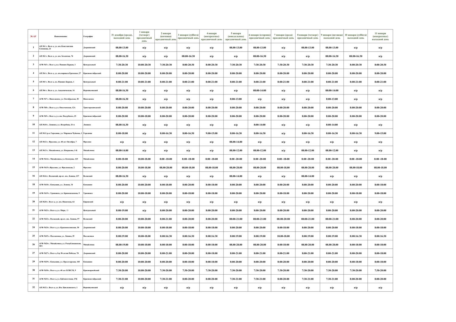 Режимы АУ и оптики на новогодние каникулы