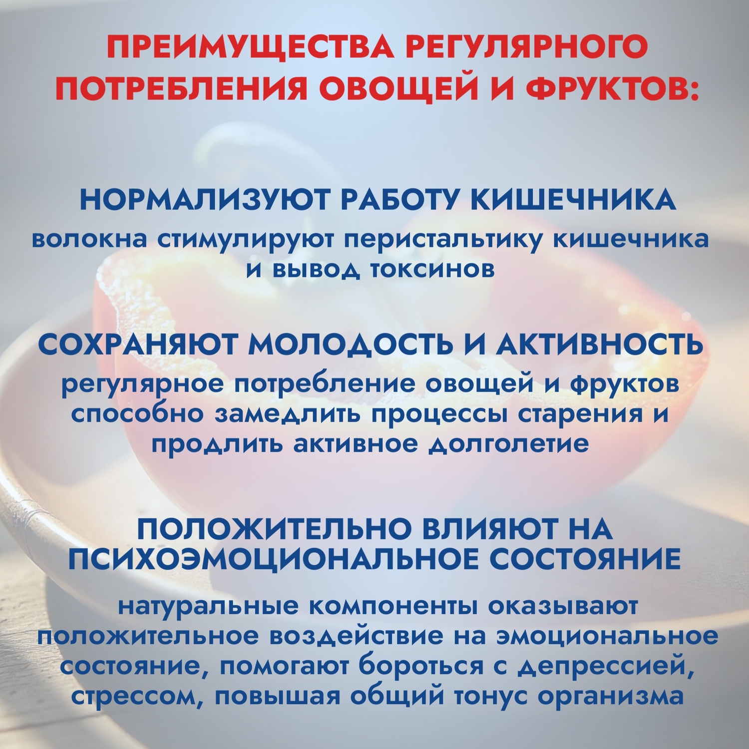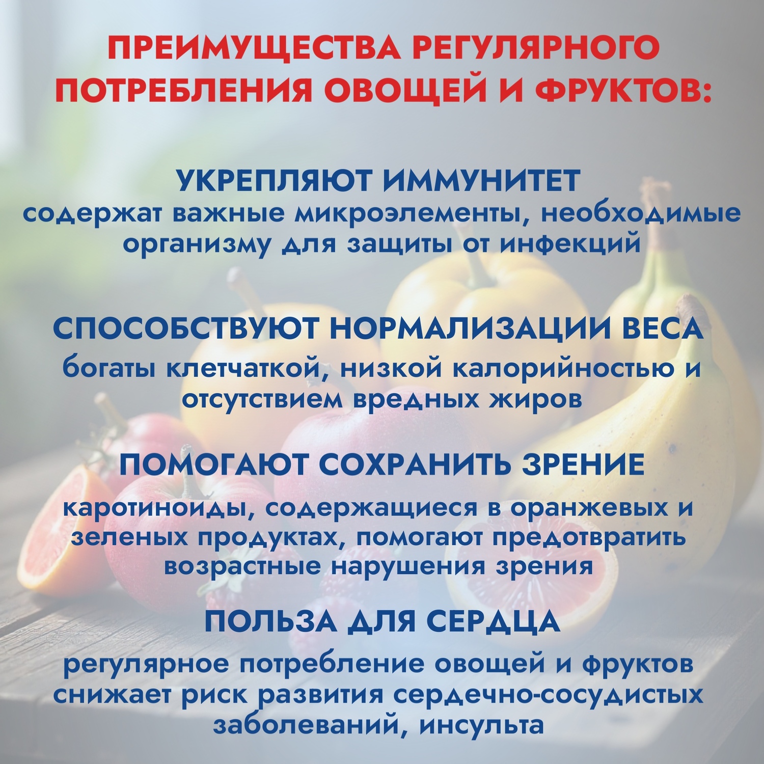 Регулярное потребление фруктов и овощей способствует снижению рисков появления заболеваний сердца и сосудов, диабета второго типа, атеросклероза, ожирения и других проблем. Кроме того, фрукты и овощи поднимают настроение, укрепляют иммунитет, способствуют похудению.