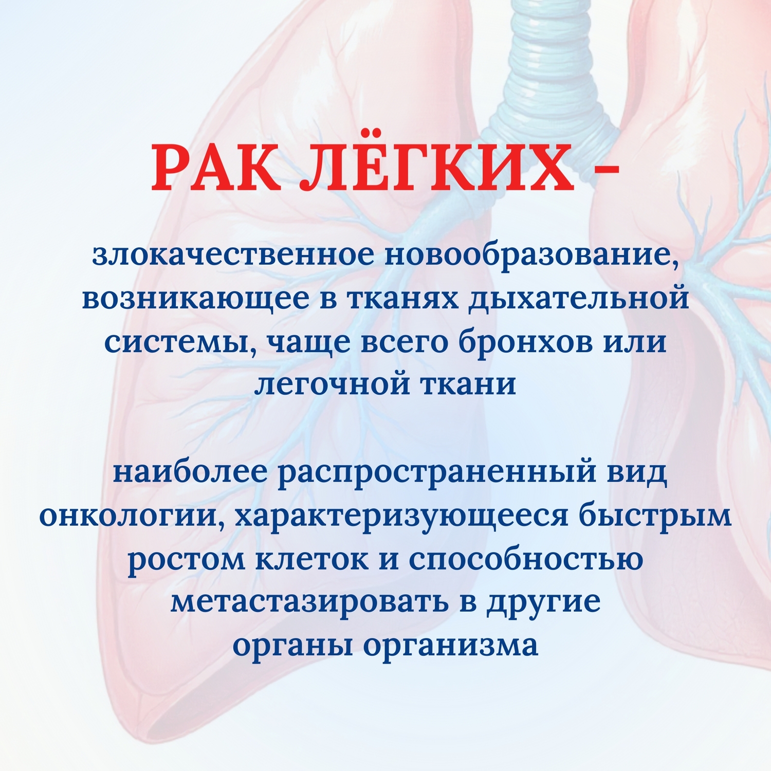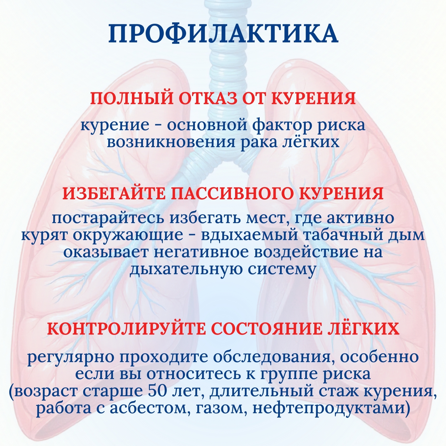 Рак лёгких остаётся одной из наиболее распространённых форм онкологических заболеваний в мире. Главным фактором риска возникновения и развития рака легких является курение.Проявляя заботу о собственном здоровье и соблюдая меры профилактики, каждый человек способен существенно снизить риск развития этого опасного заболевания.